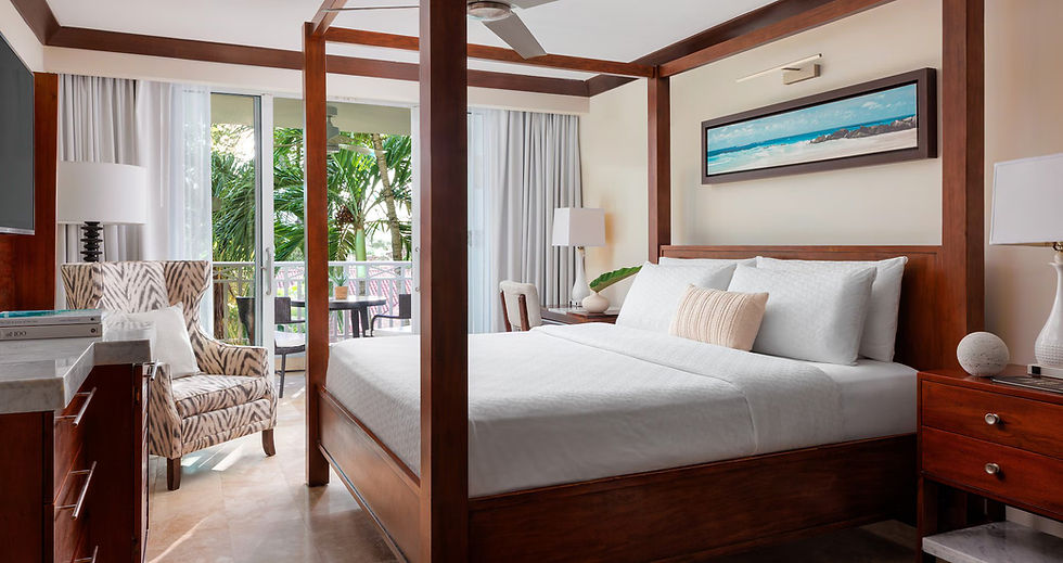 Located on the second floors for the Caribbean Village, these quaint rooms feature elegant furnishings, a four-poster, king-size bed, HD smart TV, and a private balcony showcasing serene views of the resort’s beautifully landscaped gardens. The en-suite bathroom is outfitted with a shower or bathtub with shower and penny glass tile detailing.